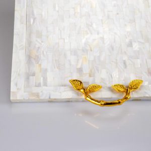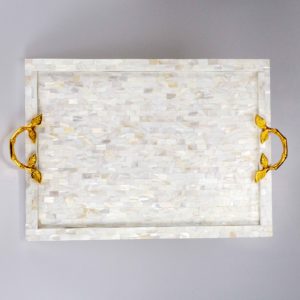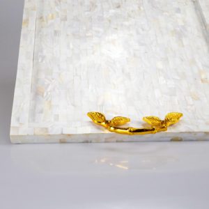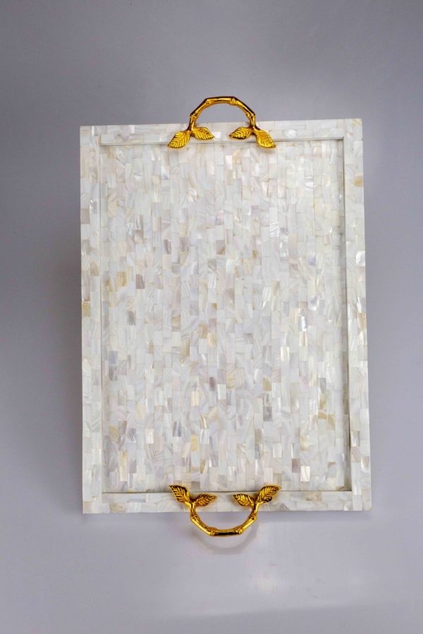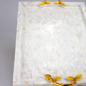 This beautiful mother of pearl serving tray adds a wonderful contemporary glam style to your living area. It is made from MDF board with a White China mix of mother of pearl inlay which is pasted on in a brickwork pattern to create a stunning dinner tray. The handles are made of steel and coated in gold.